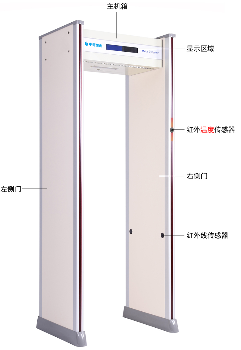 中警思創ZJSC-P10測溫通過式金屬探測安檢門:將紅外測溫與通過式金屬探測安檢門融合,通過金屬安檢門前,先進行紅外人體測溫,聲音報警,提示體溫異常,有效防止規模性疾病傳染;