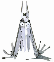鈦手柄,尖嘴鉗,普通鉗,剪線鉗,硬線剪線鉗,卷曲器,尖鋒頭平刃刀(154CM的鋼),齒刃刀,切鉤刀,鋸子,木/金屬銼刀,鉆石包層銼刀,兩個(gè)大號鉆頭擰入器,小號鉆頭,擰入器,刻度尺(8英寸/19厘米),瓶/罐起子,剝線鉗,固定系索環(huán),快速卸取的系索環(huán) ,移動式口袋夾
