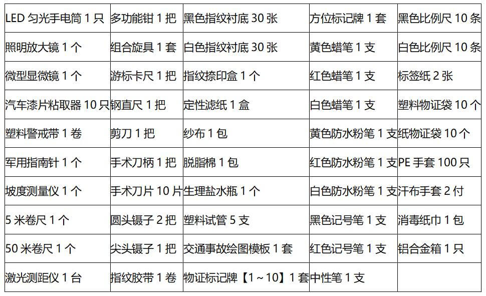 該勘查箱主要用于交通事故現(xiàn)場(chǎng)的測(cè)量、繪圖,以及相關(guān)物證的發(fā)現(xiàn)、提取和保存等工作。借助坡度測(cè)量儀和激光測(cè)距儀,使得現(xiàn)場(chǎng)測(cè)量與繪圖工作變得更加輕松自如。該箱還配備了高亮度LED勻光手電筒,為夜間的勘查工作提供照明。